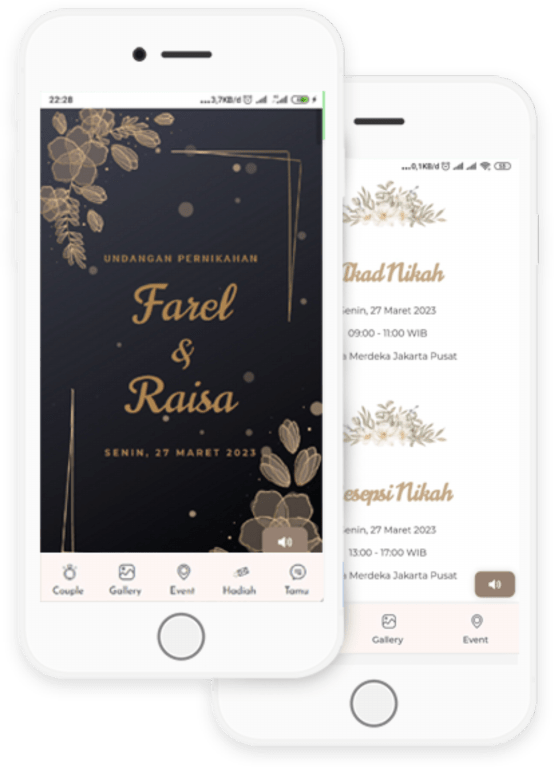 Kami menyediakan undangan website, video story, serta desain undangan cetak. Kami telah dipercaya lebih dari 90+ pasangan pengantin.